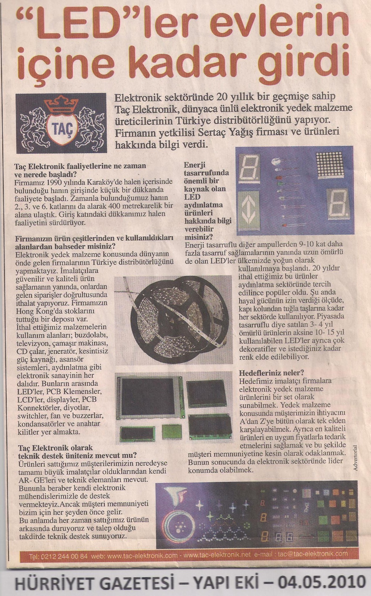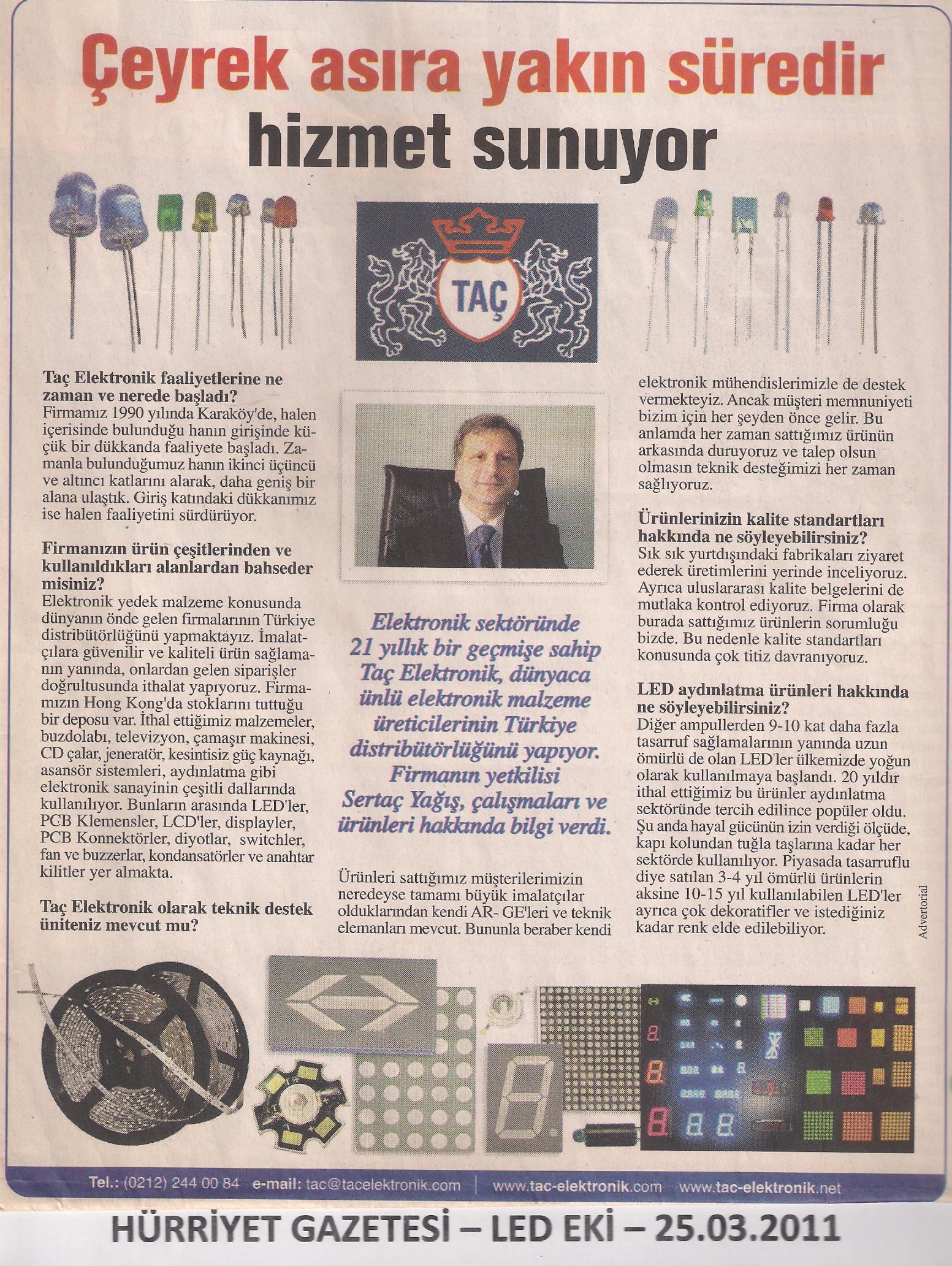 Taç elektronik 1990 yılında kurulmuş olup Elektronik yedek malzeme konusunda Dünyanın önde gelen firmalarının Türkiye Distribütörlüklerini yapmaktadır. Taç elektronik kurulduğu günden bu yana imalatçılara güvenilir ve kaliteli ürünler sağlamaktadır. Taç elektronik tüm elektronik yedek parça ve yarı iletkenleri stoktan bulabileceğiniz en doğru adrestir. Firmamız, düzenli olarak ithalat yapmaktadır, ayrıca Hong-Kong' da ofisimiz bulunmaktadır ;bu ofis yardımıyla ihtiyacınız olan komponentleri en ucuz ve en kaliteli şekilde bulmaktayız. Tac Elektronik olarak; imalatçıya yönelik ithalat yapmaktayız yani bir devrenin yapımında kullanacağınız tüm komponentleri takım halinde sağlamaktayız. Müşterilerimizin ihtiyaç duyduğu numuneleri, teknik bilgi, fiyat ve gerekli dökümanları en hızlı ve kaliteli bir şekilde bulmaları için çalışmaktayız. |